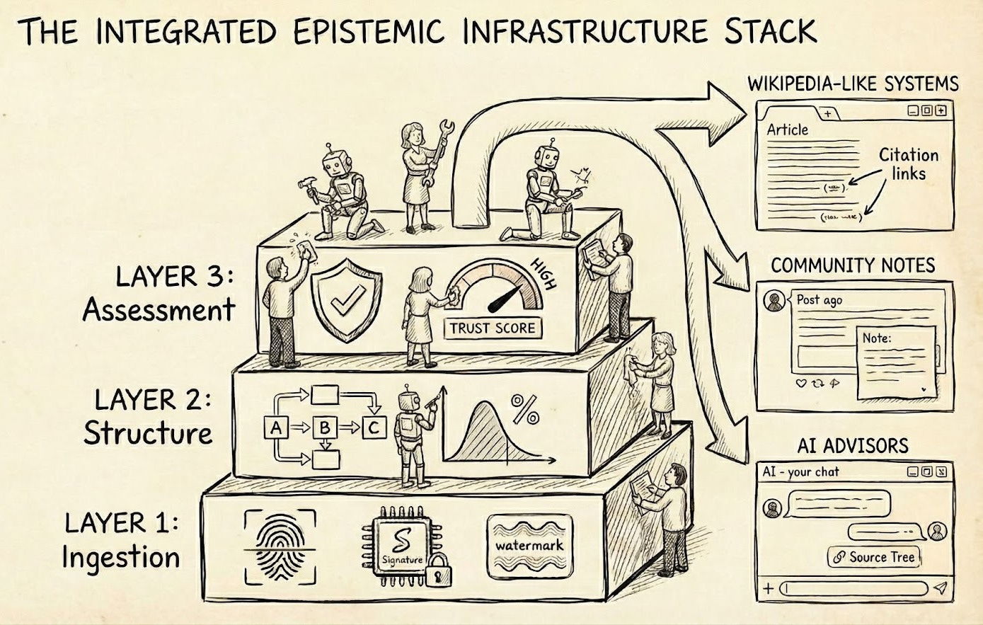 Imagine an upgrade. People faced with news articles, social media posts, research papers, chatbot responses, and so on can trivially trace their complete epistemic origins — links, citations, citations of citations, original data sources, methodologies — as well as helpful context (especially useful responses, alternative positions, and representative supporting or conflicting evidence). That’s a lot, so perhaps more realistically, most of the time, people don’t bother… but the facility is there, and everyone knows everyone knows it. More importantly, everyone knows everyone’s AI assistants know it (and we know those are far less lazy)! So the waterline of information trustworthiness and good faith discourse is raised, for good. Importantly, humans are still very much in the loop — to borrow a phrase from Audrey Tang, we might even say machines are in the human loop.