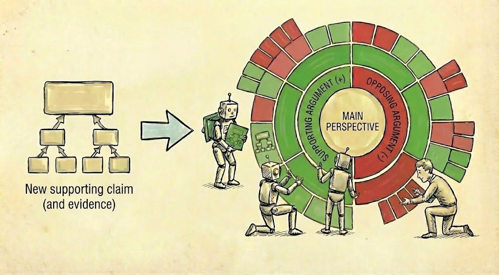 Already, LM assistance can make some of this structure more practically accessible, including in hindsight. A lightweight sharing format and caches for commonly accessed inference structure metadata can turn this into a reliable, cheap, and growing foundation: a graph of claims and purported evidence, for improved further epistemic activity like auditing, hypothesis generation, and debate mapping.