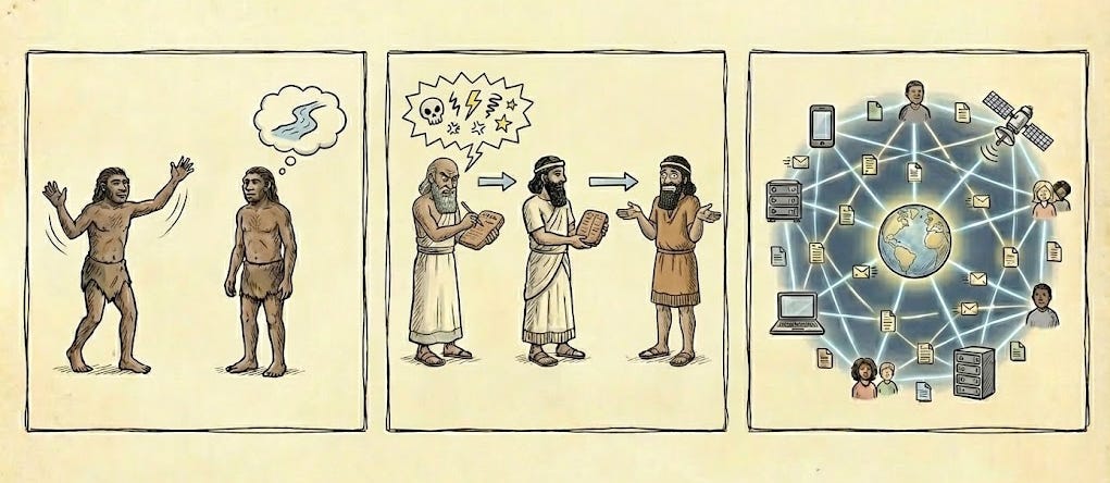 What’s involved in gathering information and forming views about our world? Humans aren’t, primarily, isolated observers. Ever since the Sumerians and their written customer complaints4, humans have received information about much of their our world from other humans, for better or worse. We sophisticated modern beings consume information diets transmitted across unprecedented distances in space, time, and network scale.