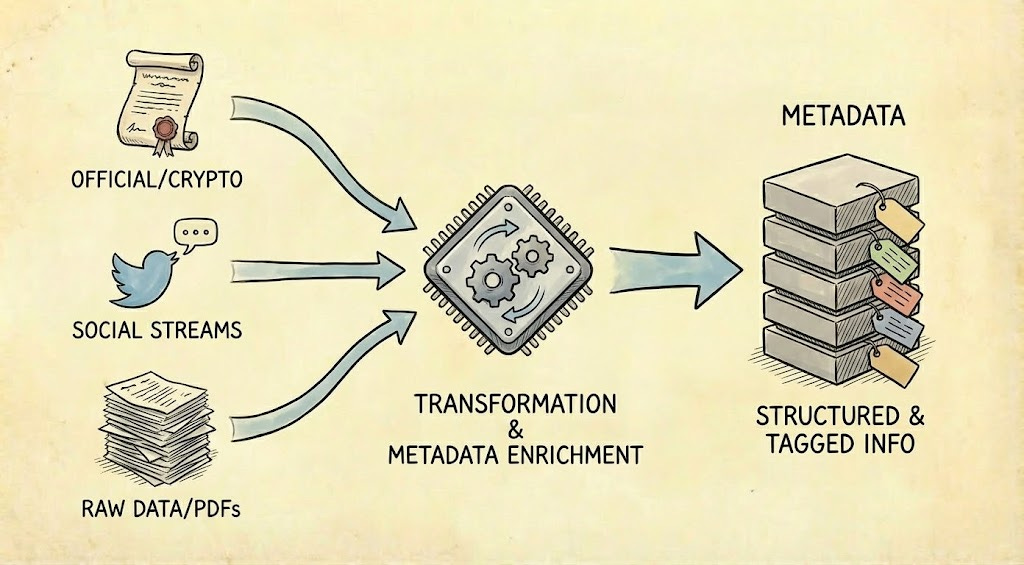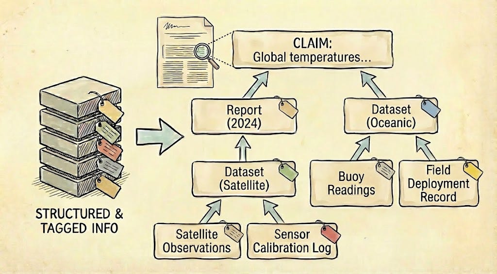 Associating artefacts with metadata about origin and authorship (and further guarantees if available) can be a multiplier on downstream knowledge activities, such as tracing the provenance of claims and sources, or evaluating track records for honesty. Thanks to AI, precise formats matter less, and tracking down this information can be much more tractable. This tractability can drive the critical mass needed to start a virtuous cycle of sharing and interoperation, which early movers can encourage by converging on lightweight protocols and metadata formats. In true 21st Century techno-optimist fashion, we think no centralised party need be responsible for storing or processing (though distributed caches and repositories can provide valuable network services, especially for indexing and lookup6).