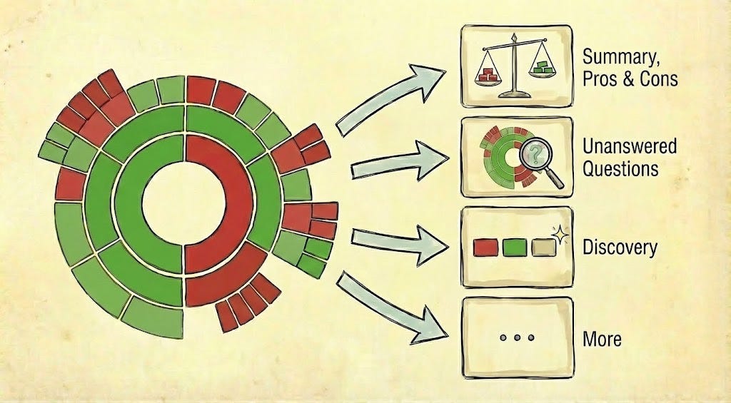 With foundational structure to draw from, this is where things start to substantially branch out and move toward the application layer. Some use cases, like summarisation, highlighting key pros and cons and uncertainties, or discovery, might directly touch users. Other times, downstream platforms and tools can integrate via a variety of customized assessment workflows.